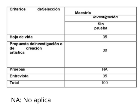 La selección de los aspirantes a los programas académicos de posgrados considera como rango de calificación una escala entre 0 y 100 puntos, asignados con base en los resultados obtenidos en los siguientes criterios: