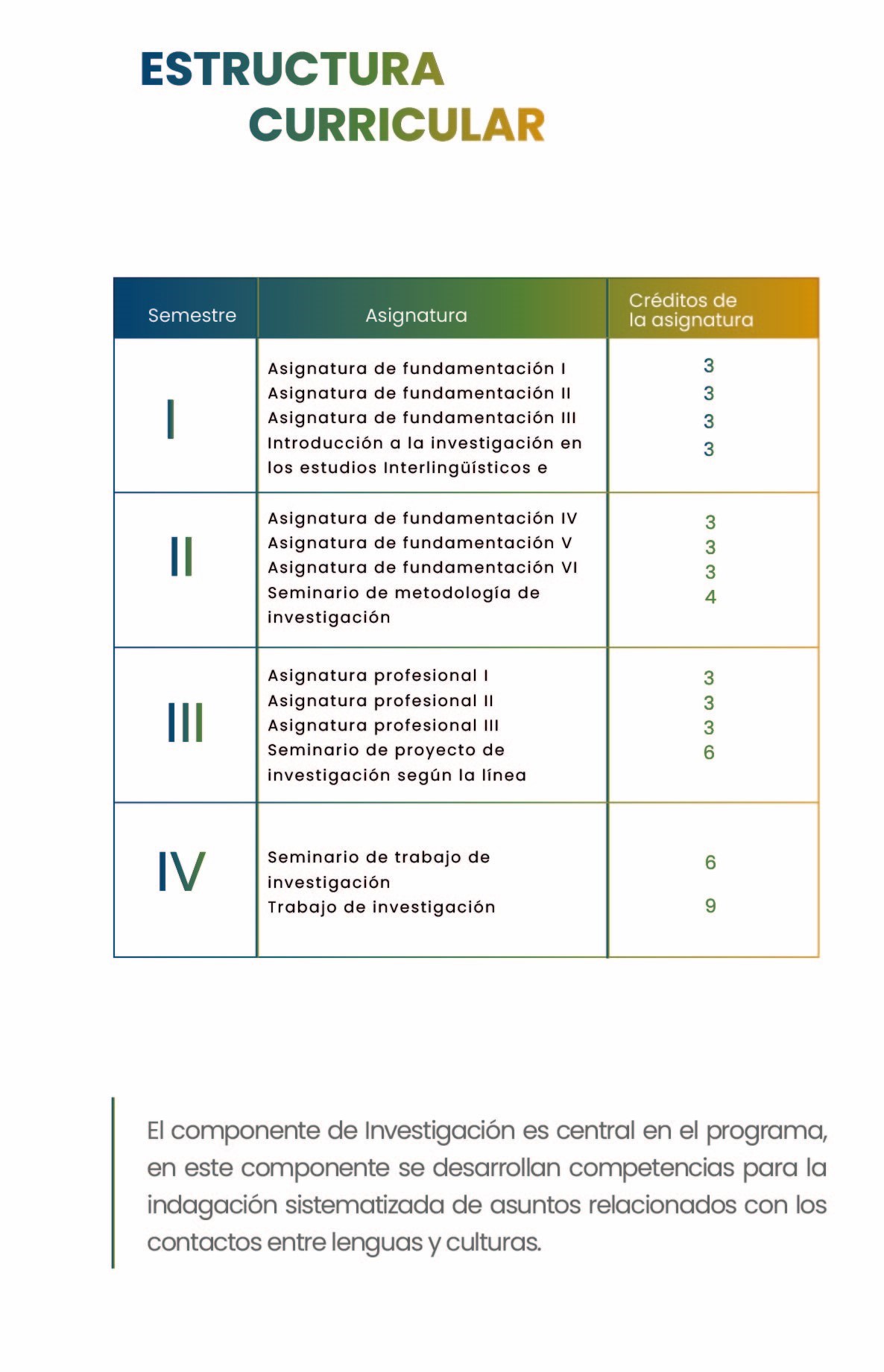 La Maestría EILIC requiere un total de 55 créditos académicos, distribuidos en los componentes de Fundamentación, Especialidad o Profesional, e Investigación. El principal componente o eje curricular de la Maestría EILIC es la Investigación, alrededor de la cual se desarrollan sus actividades curriculares. A través del componente de Fundamentación, los estudiantes se nutren de los saberes básicos para el trabajo en entornos de contactos interlingüísticos e interculturales: En el componente de Especialidad (o Profesionales), cada estudiante elige, según sus intereses académicos, profesionales y laborales, el área en que quiere utilizar sus conocimientos -enseñanza y adquisición de segundas lenguas, bilingüismo y educación bilingüe o traducción y terminología. En el área de especialidad elegida, el estudiante desarrolla su trabajo de Investigación.